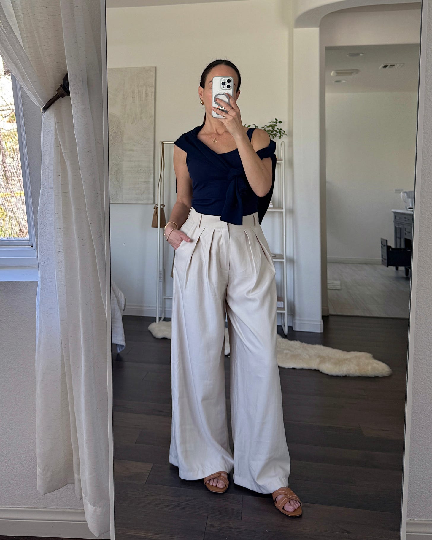My fave part about the minimalist trend is you look chic with very little effort. Tank + wide leg pants + a cardi tied around your shoulders + a few extra gold pieces of jewelry + a low bun = less than five minutes of styling.