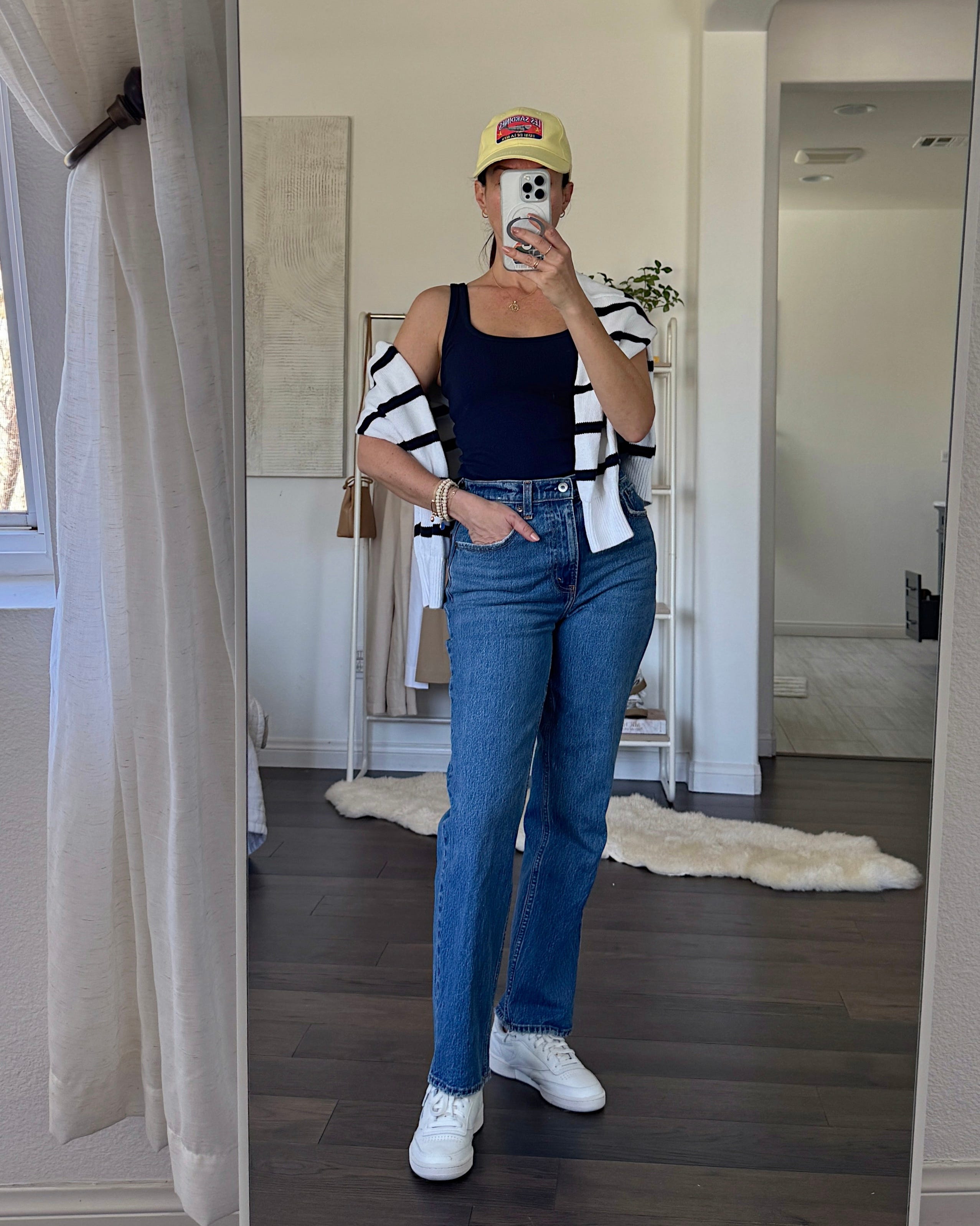 San Diego is super chilly in the mornings. I’ve worn this striped sweater we styled earlier on a weekly basis. Later in the day, I’ll throw it over my shoulders with a white tee or my navy tank. The rest of the formula generally stays the same: jeans + white sneakers + some type of baseball cap.