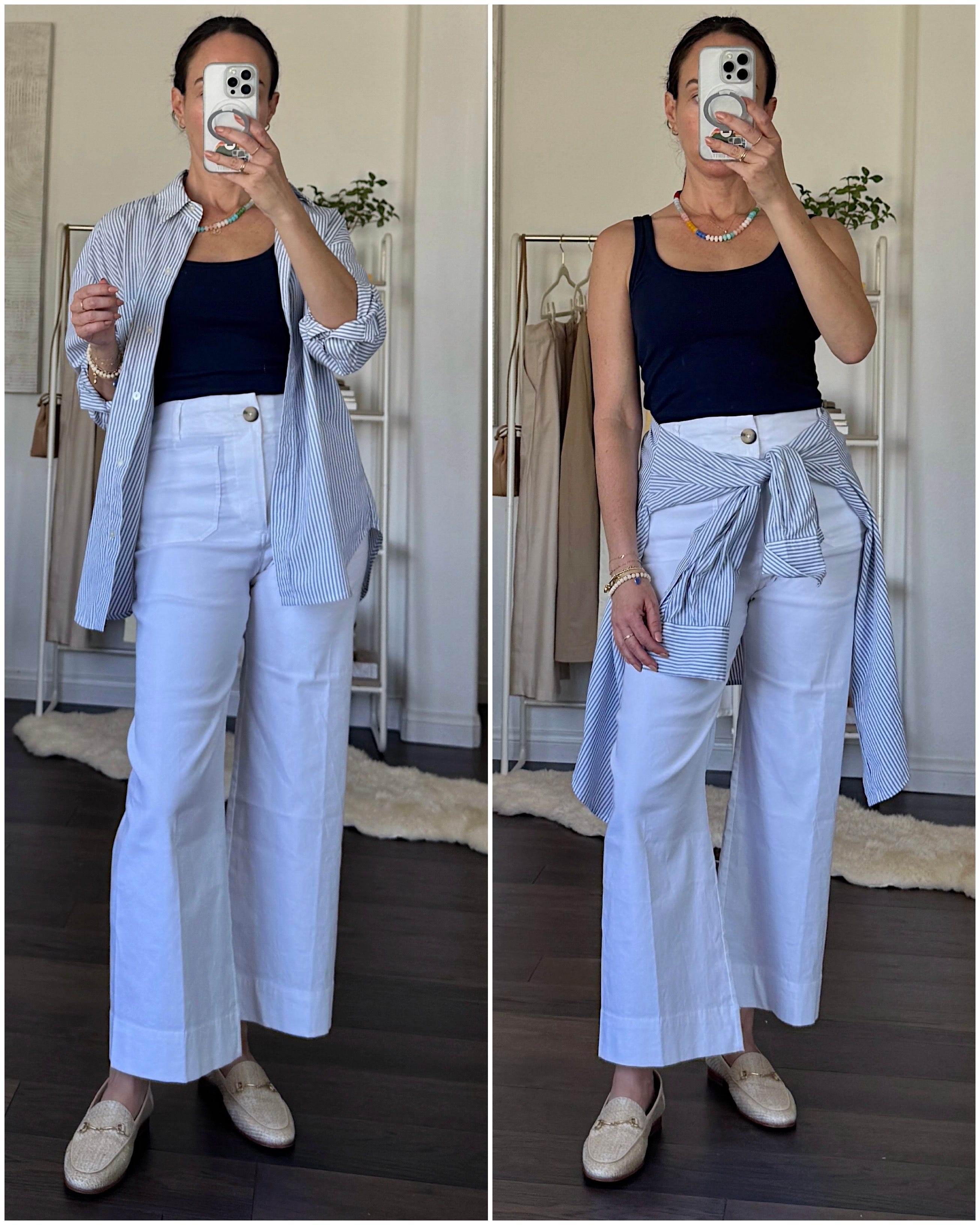 One way I’ve been styling my white ones is with something longer on top or tied around my waist. Not because they’re see through, but because mom life often results in me sitting on my son’s snacks. During the summer, I love an oversized button-down worn open as a jacket. Loafers add prep. Beaded necklace adds a playful factor.